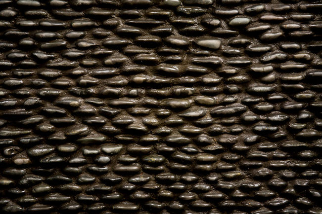 in a pebbles mosaic and complimented with black basalt sett paving laid in a circular pattern with a central water feature.